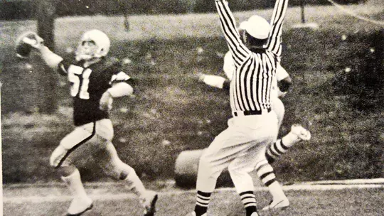 “He commanded the field, commanded the huddle; an absolute leader with wonderful football intelligence,” said classmate, fellow team captain and running back Gordie Speicher ’78. “He was a take-charge guy, which you need in a quarterback.”
