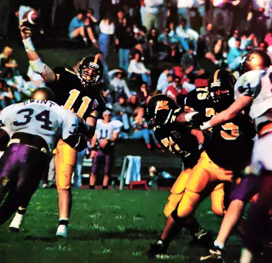 The running game was certainly potent, but the ’95 Marauders boasted a balanced offensive attack, rushing for 2,100 yards and passing for 2,505. Moylan, in his second year as a starter, set Millersville records for completions (175), completion percentage (.636), yards (2,310) and touchdowns (22) while throwing only six picks.